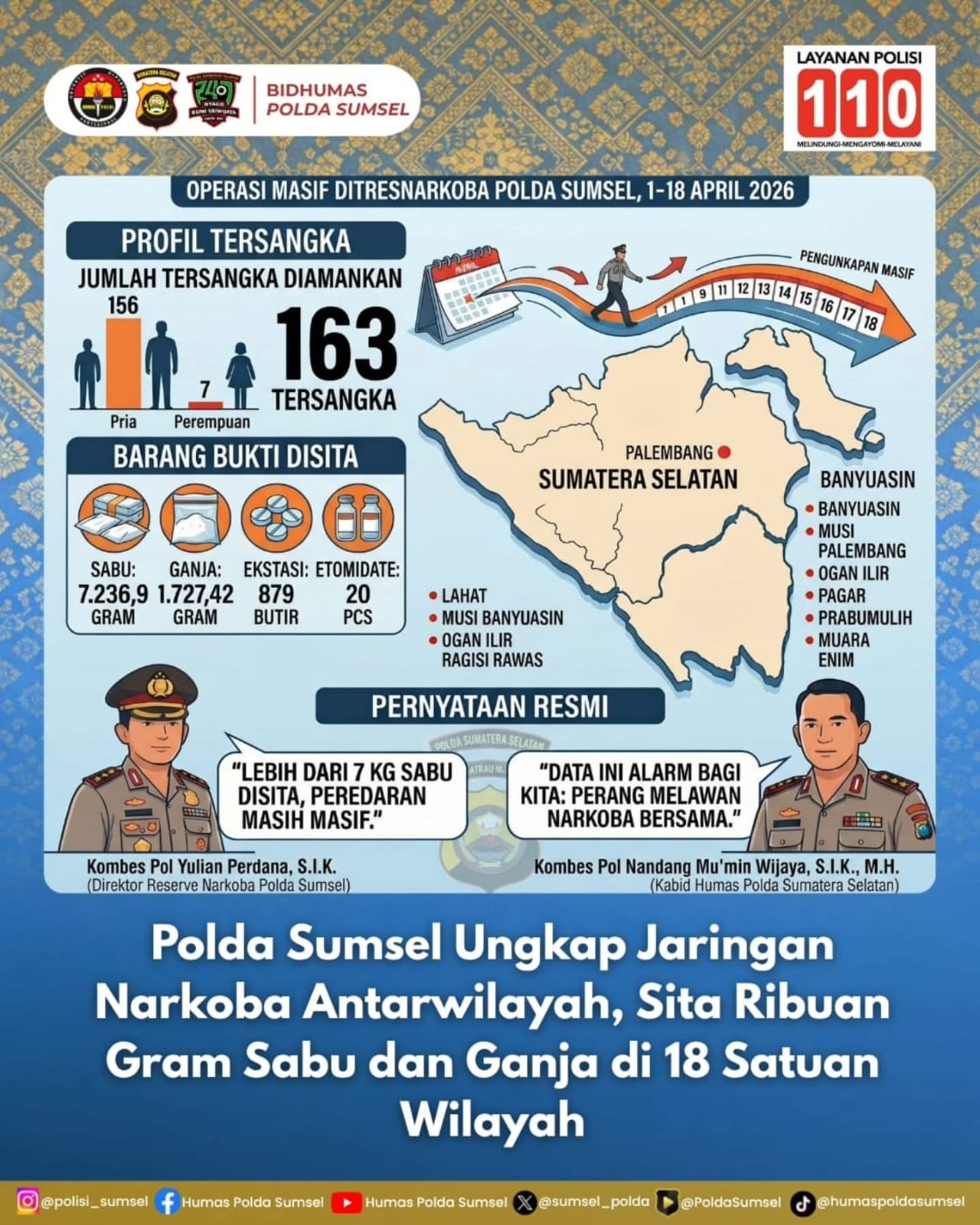 Polda Sumatera Selatan melalui Direktorat Reserse Narkoba dan jajaran satuan wilayah sukses mengungkap 116 kasus narkotika dengan meringkus 163 tersangka selama periode 1–18 April 2026.