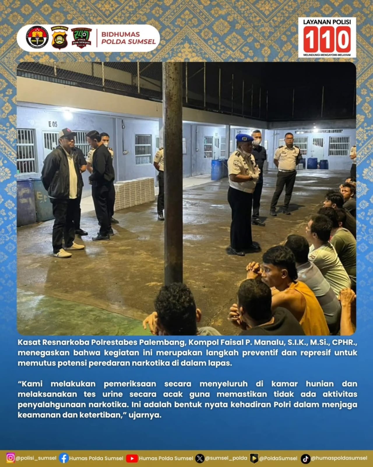 Kasat Resnarkoba Polrestabes Palembang Kompol Faisal P. Manalu, S.I.K., M.Si., menegaskan bahwa tindakan ini merupakan wujud nyata pengawasan ketat institusi.“Kami melakukan pemeriksaan secara menyeluruh di kamar hunian dan melaksanakan tes urine secara acak guna memastikan tidak ada aktivitas penyalahgunaan narkotika. Ini adalah bentuk nyata kehadiran Polri dalam menjaga keamanan dan ketertiban,” ujarnya.Kabid Humas Polda Sumsel Kombes Pol Nandang Mu’min Wijaya, S.I.K., M.H., menambahkan bahwa sinergi lintas sektoral menjadi kunci dalam menjaga stabilitas kamtibmas.“Polda Sumatera Selatan berkomitmen penuh mendukung program prioritas pemerintah dalam menciptakan stabilitam yg kamtibmas.
